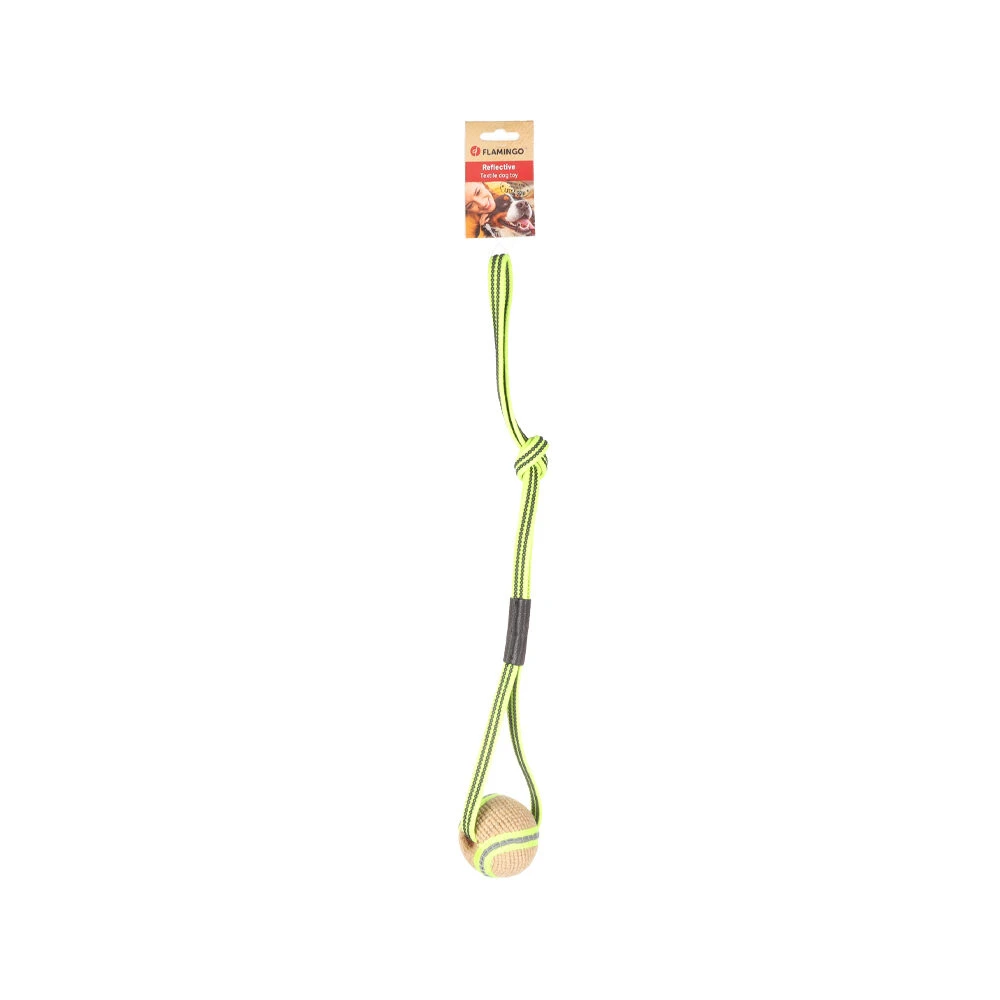 Das Flamingo-Zugseil mit Ball und Griff ist speziell für interaktive Spielstunden mit Ihrem Hund konzipiert. Das robuste Seil verfügt über einen komfortablen Griff, ideal für Ziehspiele. Dank der leuchtenden Farbe ist das Seil selbst im Gras gut sichtbar. Es ist aus Jute gefertigt und für den täglichen Einsatz geeignet.