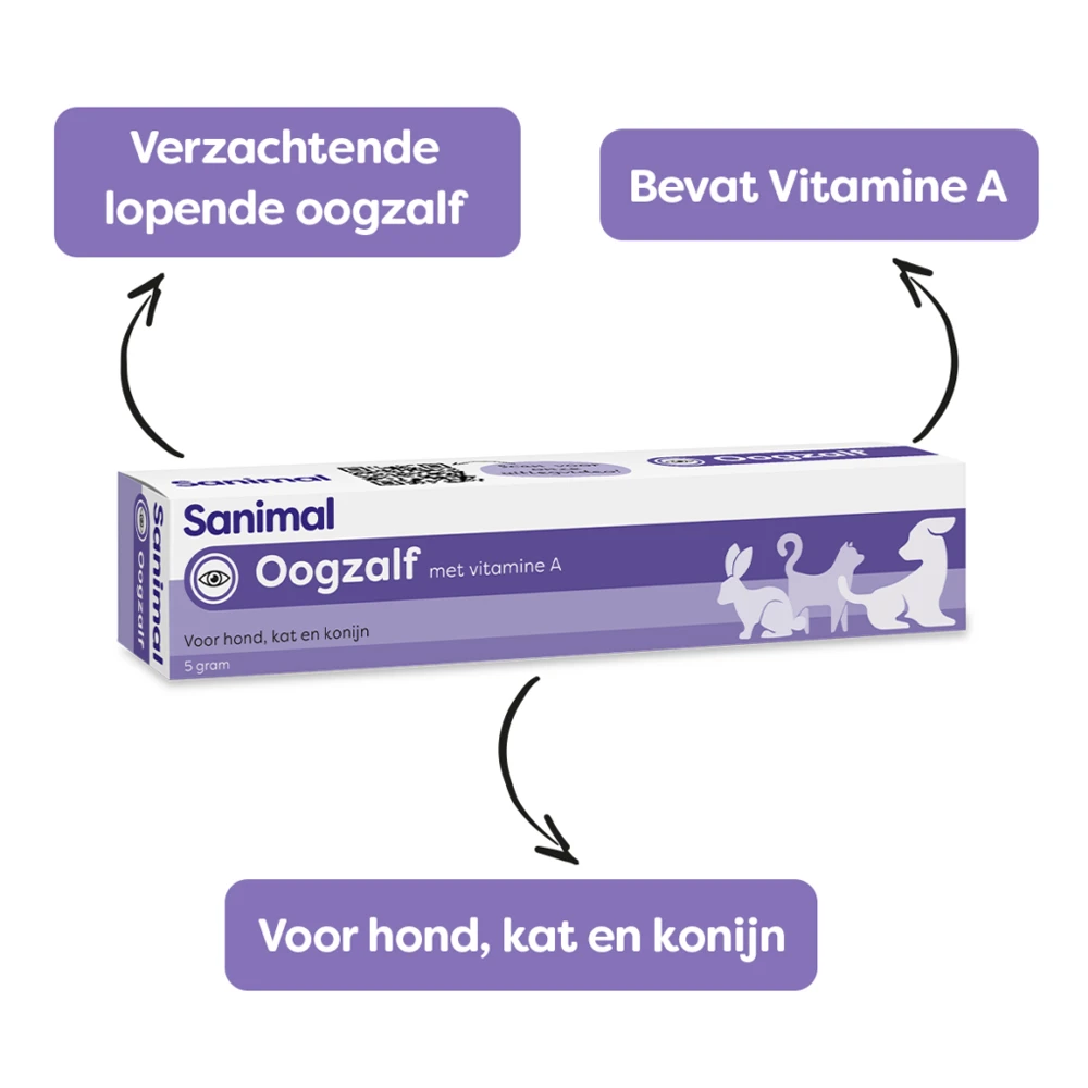 Sanimal Augensalbe ist eine beruhigende Augensalbe mit Vitamin A. Diese Salbe unterstützt empfindliche, gereizte Augedeider bei Hunden, Katzen und Kaninchen. Vitamin A ist sehr wichtig für die Augen. Ein Mangel kann zu trockenen Augen führen. Außerdem hält Vitamin A die Augenzellen und das Gewebe des Auges gesund und sorgt für eine gesunde Netzhaut. Geeignet für alle Altersgruppen zur Erhaltung gesunder Augen.